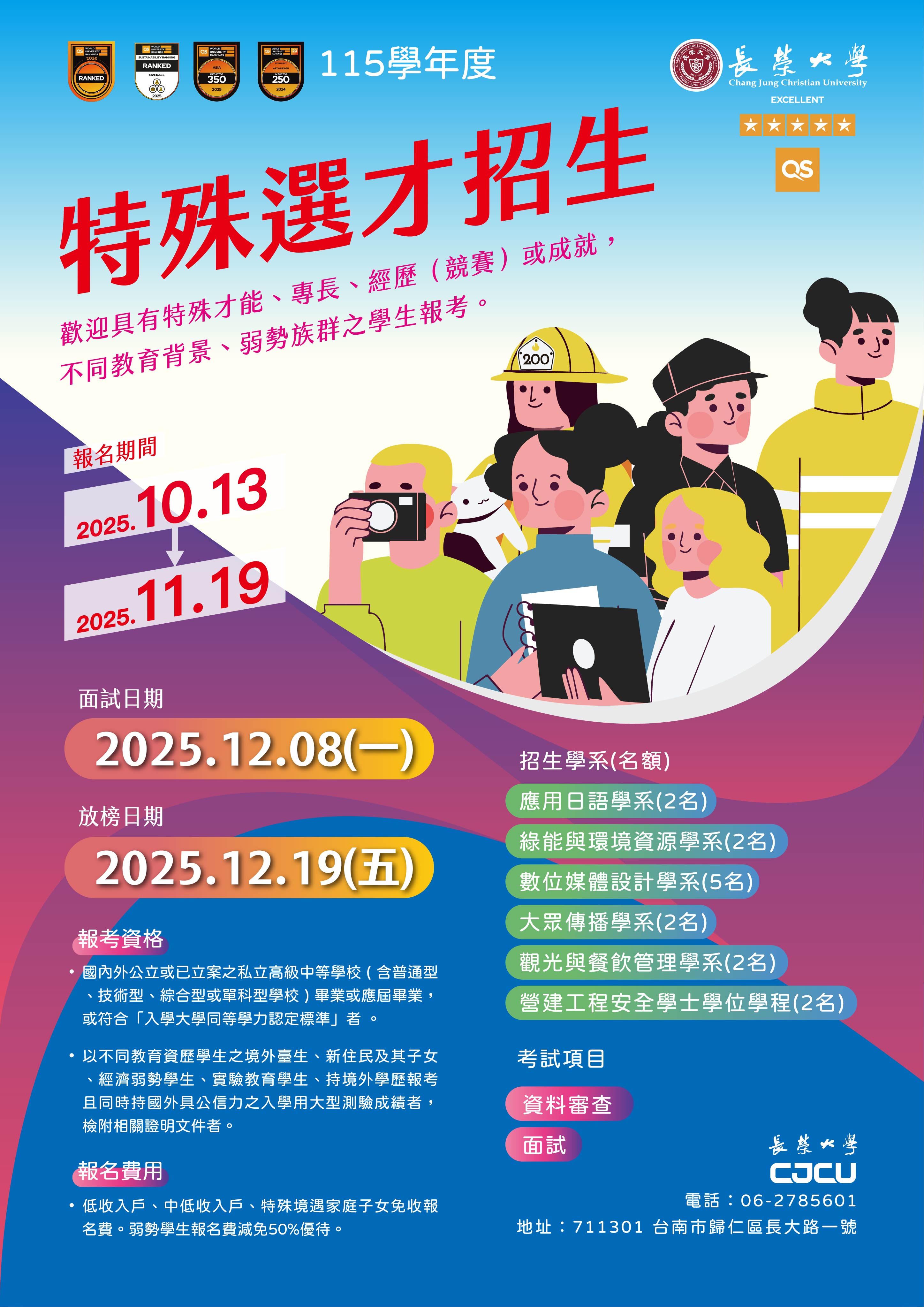 - 本校為鼓勵具特殊才能、專長、經歷(競賽)或成就,不同教育背景及弱勢族群之學生進入大學就讀,特辦理115學年度特殊選才招生。