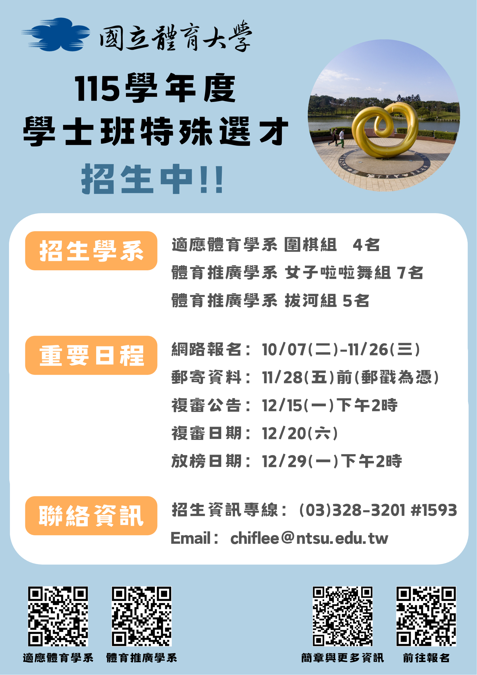 體育大學115學年度學士班特殊選才招生資訊
