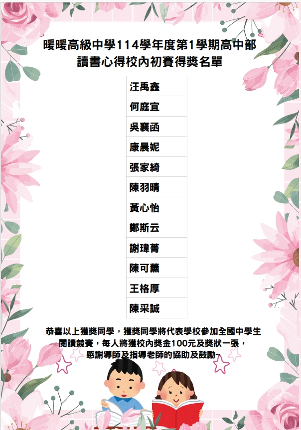 基隆市暖暖高級中學114學年度第1學期高中部中英文讀書心得比賽 校內初賽成績